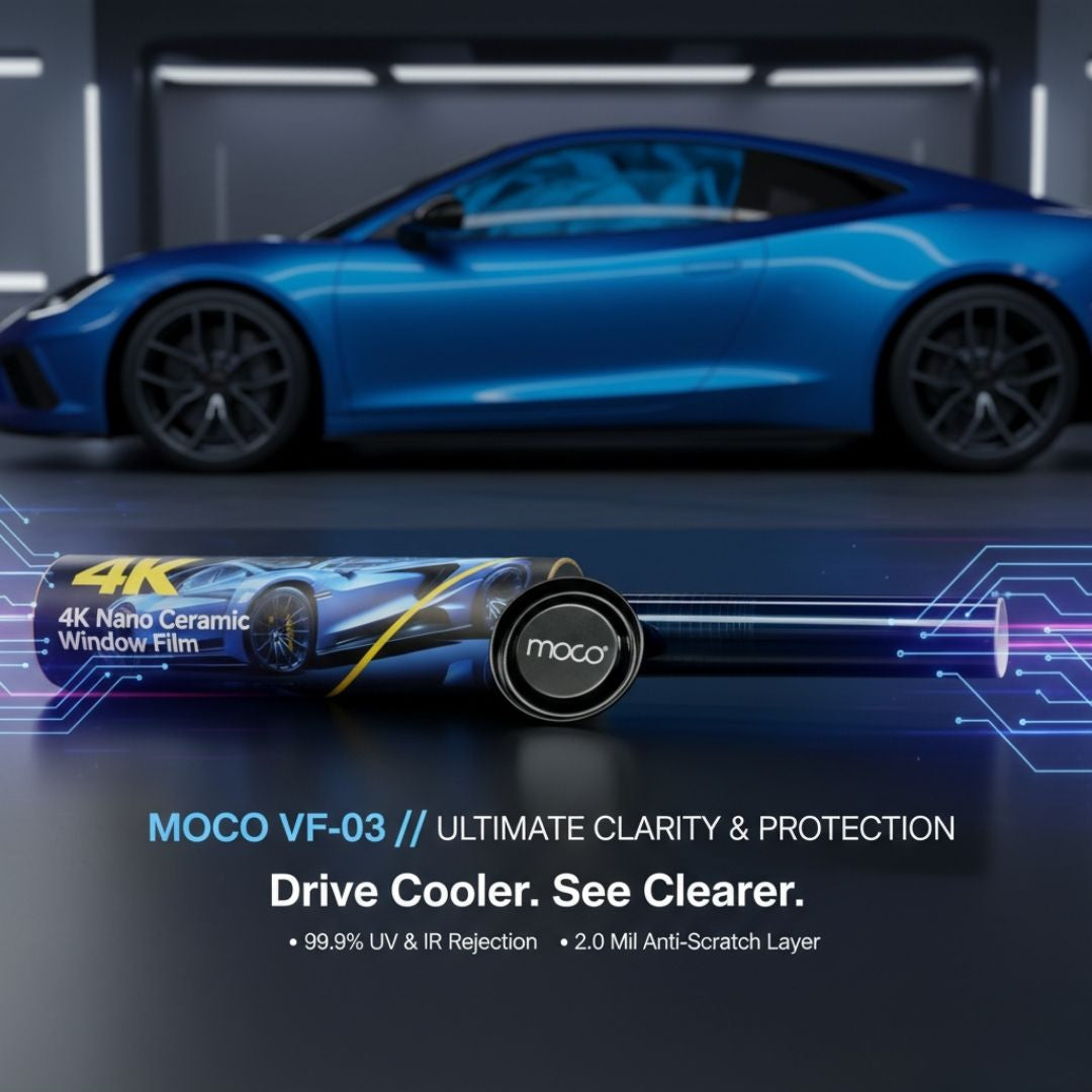 VF-03 is a 4K Nano Ceramic Window Film offering 99.9% UV protection, 98.6% IR rejection, and 70% visibility with anti-glare clarity.