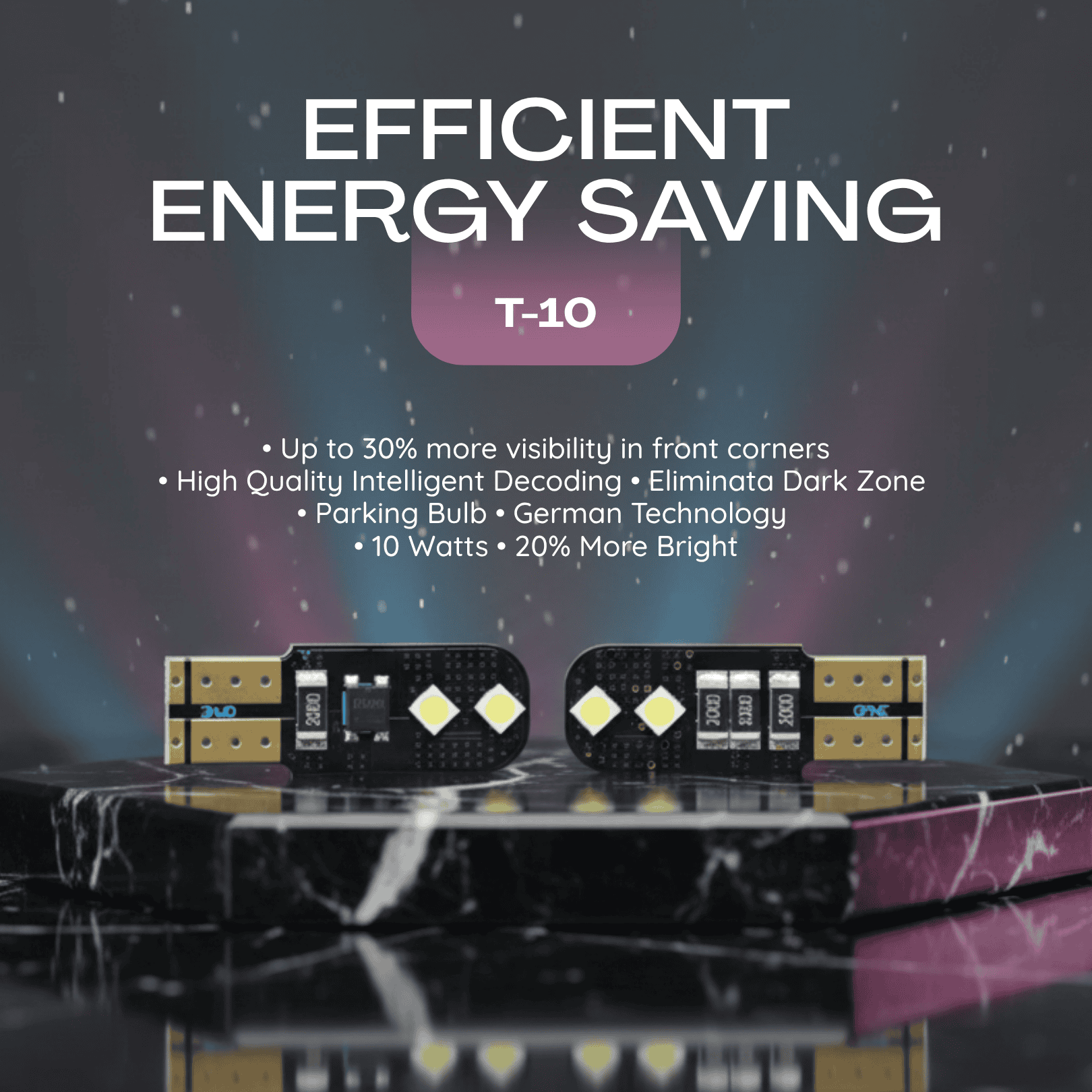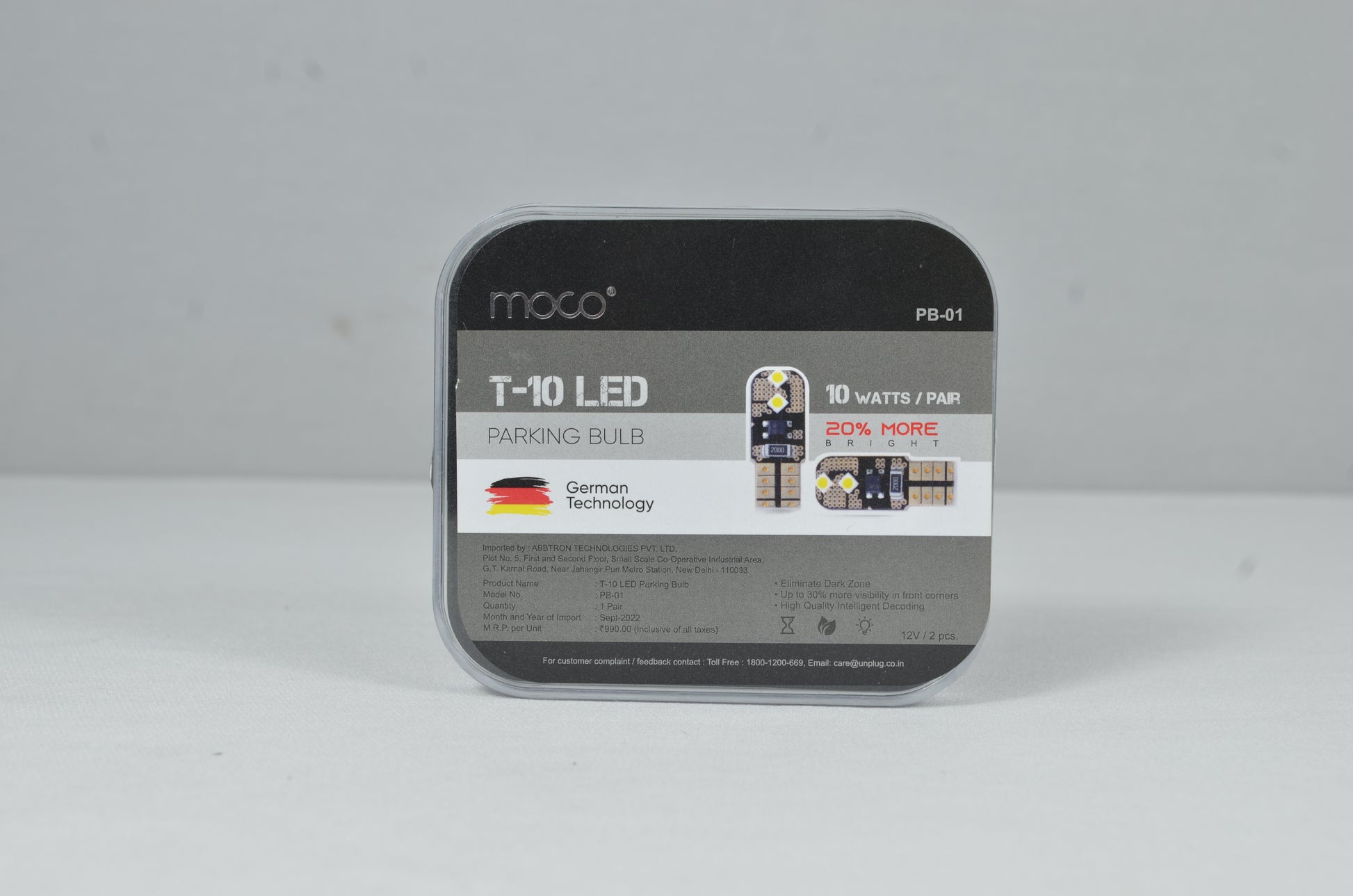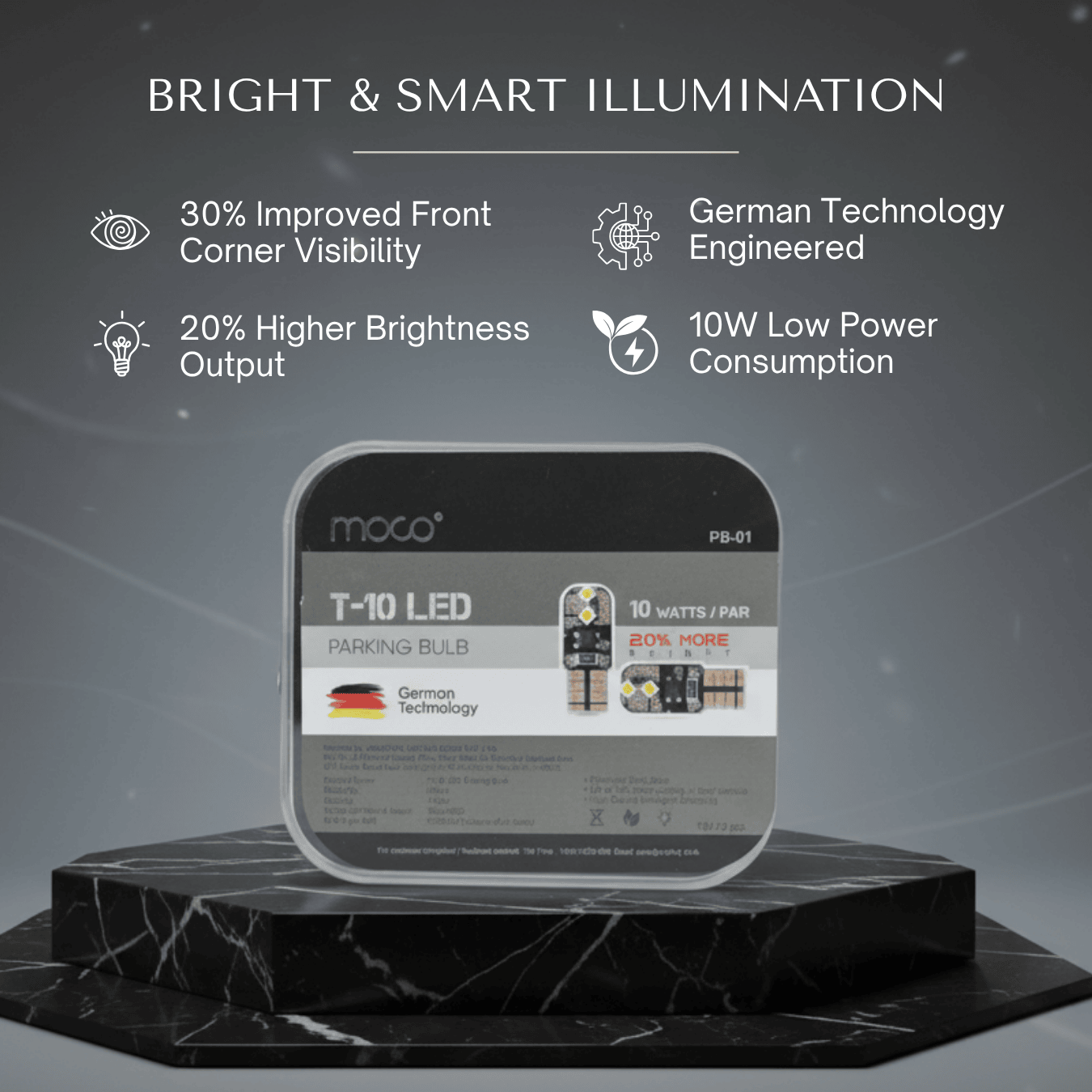 The PB-01 parking bulb delivers up to 30% improved visibility in front corners and 20% higher brightness using advanced German technology. It features intelligent decoding for seamless vehicle integration, eliminates dark zones for safer driving, and runs on just 10 watts, making it a compact, efficient, and highly effective lighting solution.