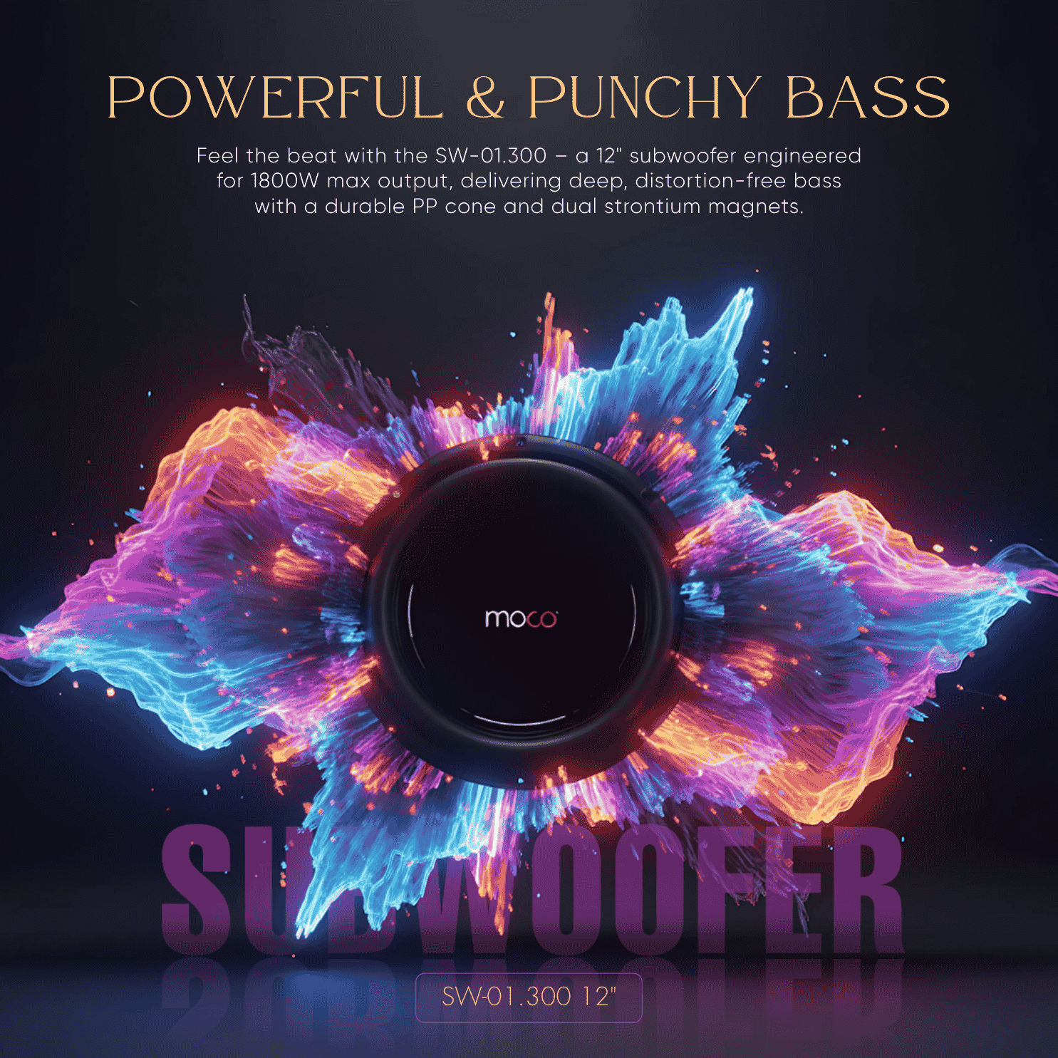 SW-01.300 is a 12” high-power subwoofer delivering 1800W max output, deep bass, and rich sound with a dual strontium magnet and durable PP cone design.