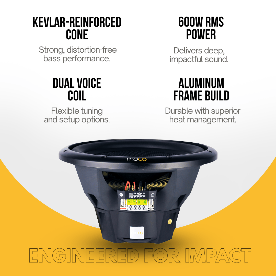 Powered by a dual 2"" (50mm) voice coil (4Ω+4Ω) and twin Strontium magnets (100 oz total), this subwoofer delivers a massive 600W RMS and up to 3000W peak power. The frequency range of 28Hz–500Hz captures deep lows with stunning clarity and punch.