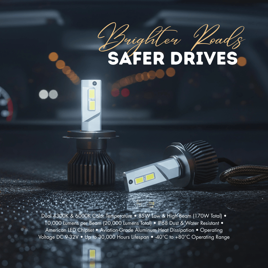 The L-10 Pro offers powerful and reliable LED lighting with dual color temperature options (4300K and 6000K) designed for superior visibility and enhanced driving safety. Equipped with an advanced American chipset and robust heat dissipation via aviation-grade aluminum, this headlight ensures long life and exceptional performance under all conditions.
