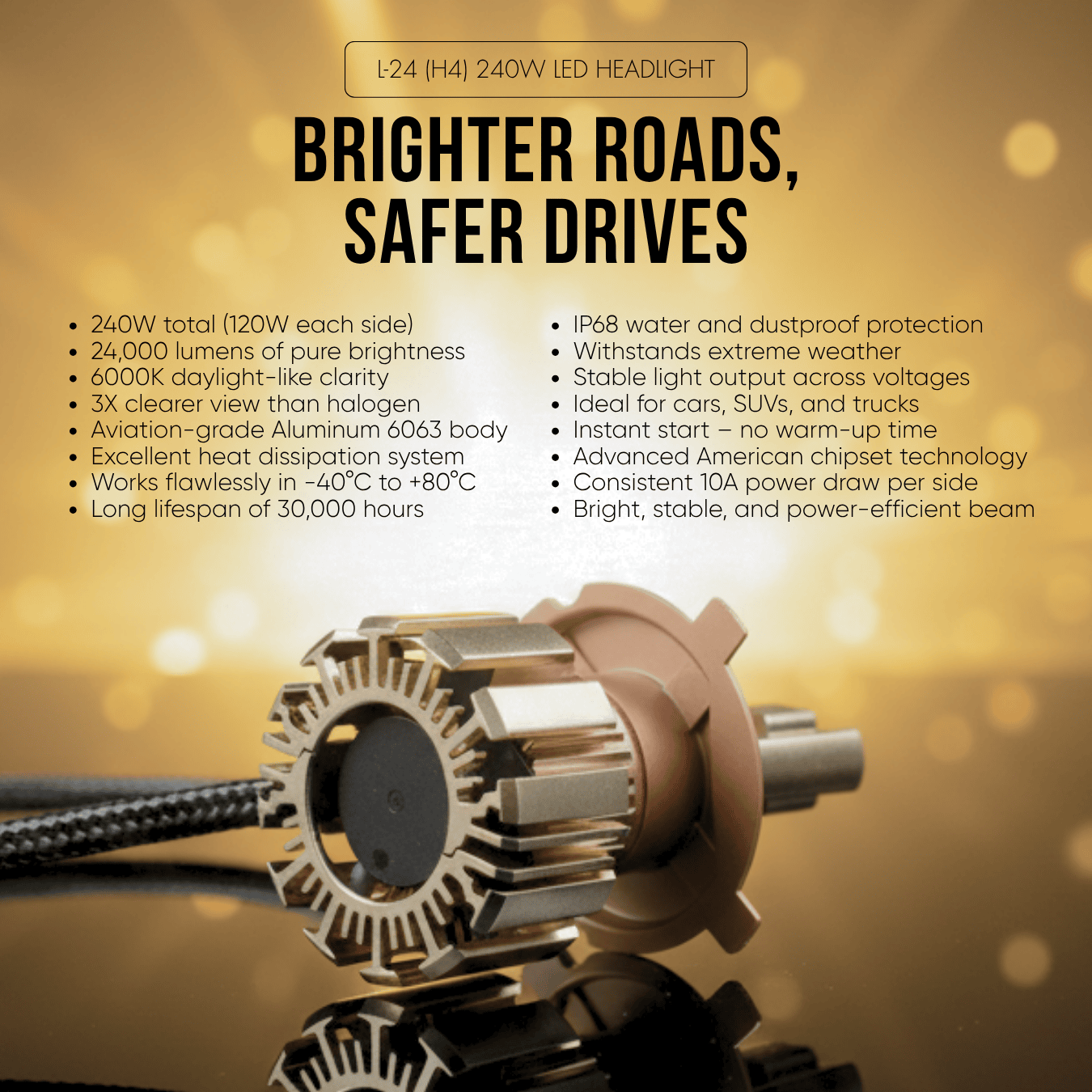 The L-24 (H4) is a premium-grade 240W LED headlight engineered for performance, durability, and unmatched brightness. With advanced American chipset technology and aviation-grade aluminum construction, it offers a perfect upgrade for night-time driving, off-road adventures, and extreme weather conditions.