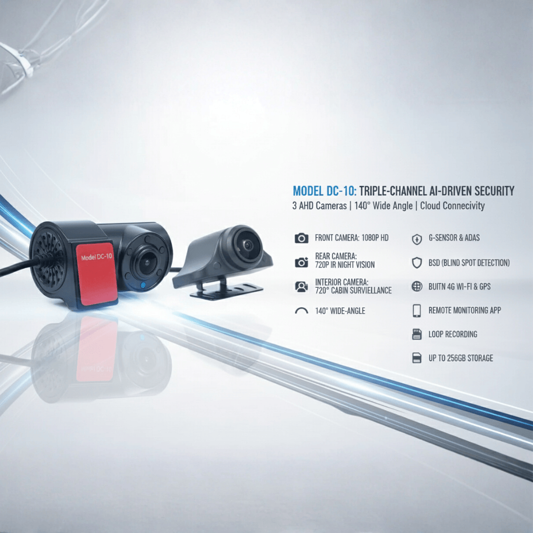 DC-10 is a 3-channel AHD dashcam with 4G Wi-Fi, ADAS, live remote monitoring, and 1080P front camera—built for advanced commercial vehicle surveillance.